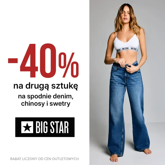Otrzymaj 40% rabatu na drugą sztukę. Promocja dotyczy wybranych grup asortymentowych SPODNIE DENIM, CHINOSY, SWETRY.
