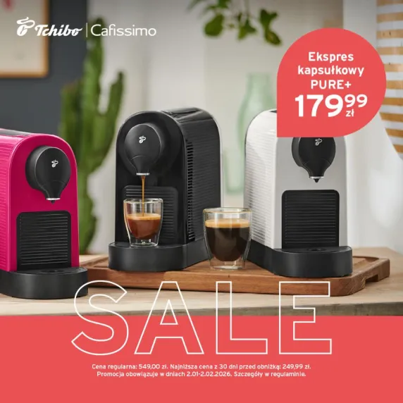 Twoja ulubiona kawa zaczyna się tutaj. Ekspres kapsułkowy Tchibo Cafissimo PURE+ teraz w wyjątkowej cenie 179,99 zł. Elegancki design, doskonały smak, codzienna przyjemność.
