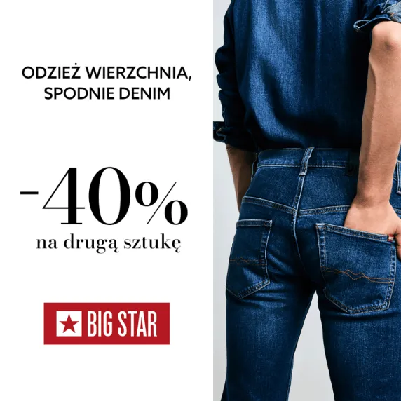 -40% NA DRUGĄ SZTUKĘ w BIG STAR! Otrzymaj 40% rabatu na drugą sztukę. Promocja dotyczy wybranych grup asortymentowych: ODZIEŻ WIERZCHNIA, SPODNIE DENIM.