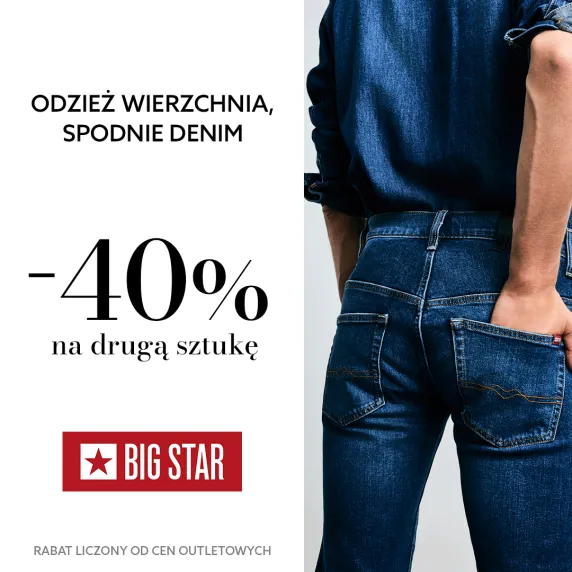 Otrzymaj 40% rabatu na drugą sztukę. Promocja dotyczy wybranych grup asortymentowych: ODZIEŻ WIERZCHNIA, SPODNIE DENIM.
